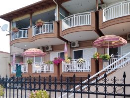 Vila Sokratis se nalazi u neposrednoj blizini centra, na oko 220 metara od pešačke zone i lepe peščane plaže. Pored recepcije sa malim lobijem (besplatan Wi-Fi), toaletom i velikom terasom u prizemlju, sastoji se od odličnih, dvokrevetnih studija i prostranih apartmana (na prvom spratu). Dvokrevetni studiji sadrže kuhinjski deo, dva spojena standardna ležaja, kupatilo i lepu, veliku terasu sa garniturom za sedenje. Opremljeni su TV-om, aparatom za brzo grejanje vode, aspiratorom i klima uređajem (uz doplatu na licu mesta). Veličina studija je cca 20 kvm + velika terasa.